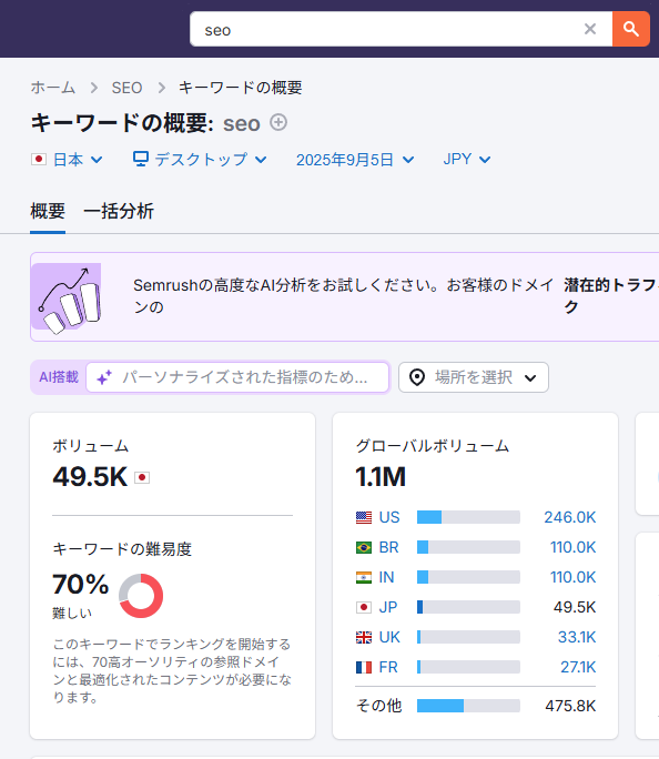 Semrushでは、検索ボリュームや関連キーワードを一目で確認できます。これにより「どの表現で顧客が検索しているか」「潜在的なニーズは何か」を数値で把握することができます。