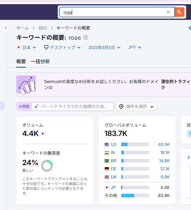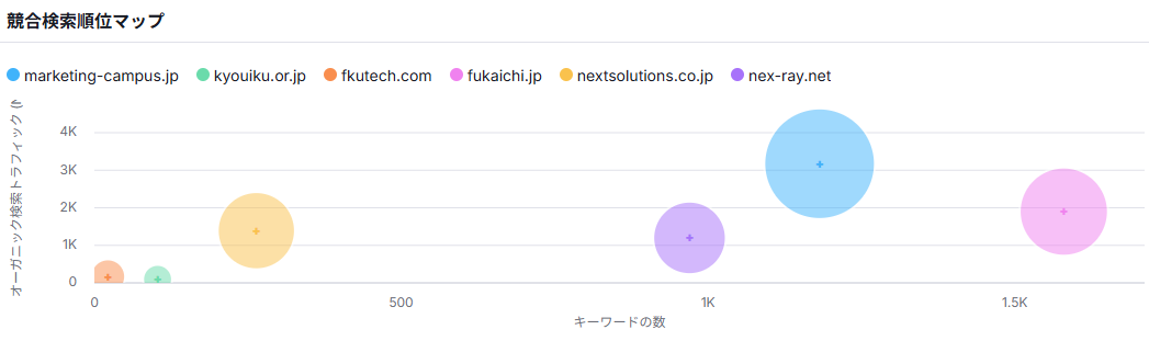需要の大きさ(検索ボリューム)と競合の強さ(キーワード難易度)を比較することで、「まず取り組むべきキーワード」「後回しにしてよい領域」を明確化できます。これにより、限られたリソースを最も効果的に投資できる戦略が立てられます。
