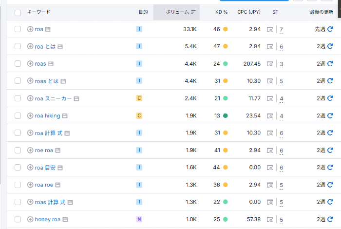 roas(左写真)はボリュームが少なく難易度も易しい,一方でseo(右写真)はボリュームも多く難易度も難しい