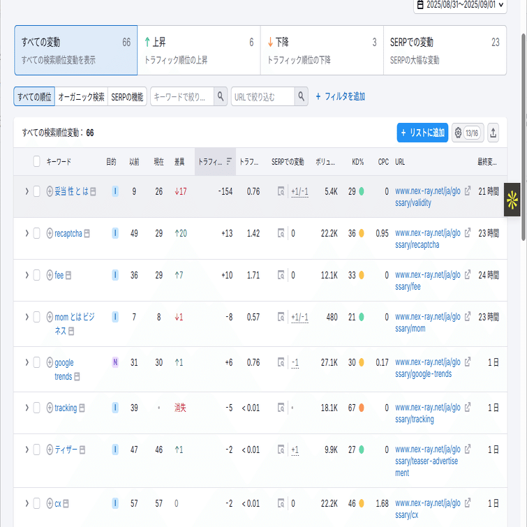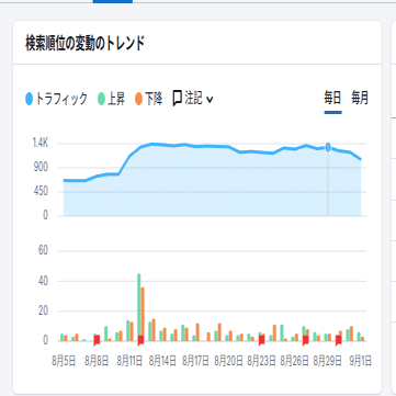 自分のサイトを分析してみると、キーワードごとの 順位変動レポート が出てきます。