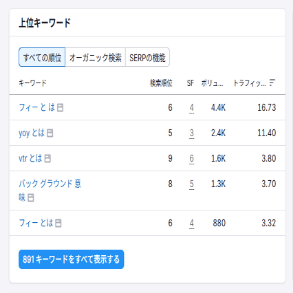 ドメインを入力するだけで、そのサイトが Google検索の上位100位以内にランクインしているキーワード が一覧で出てきます。